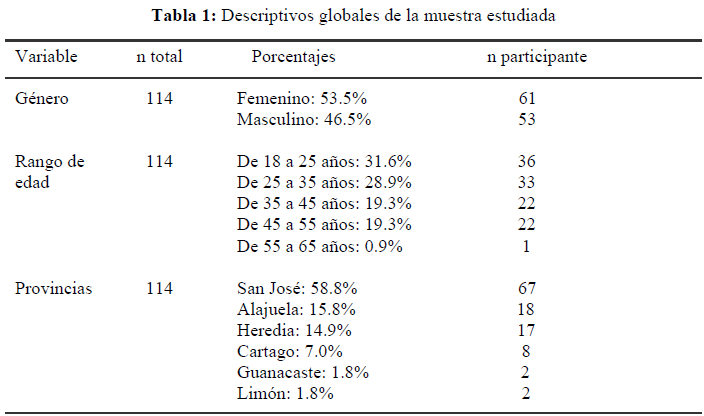 Como se puede apreciar en la información de la tabla 1 se obtuvo una muestra de 114 personas, con una participación de 53.5% de personas de género femenino y 46.5% de género masculino, en los rangos de edad que se tuvo mayor participación fue de 18 a 25 años con un 31.6% y de 25 a 35 años con un 28.9%, asimismo, las provincias con más participación se encuentran ubicadas dentro del GAM.