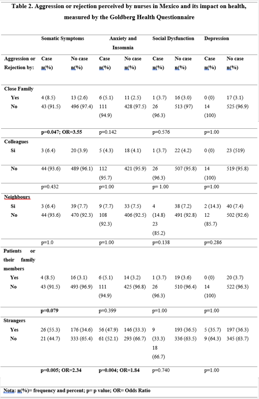 When comparing the GHQ dimensions with the results of the concurrent survey for the perception of aggression or rejection among nurses in Mexico, we found statistically significant differences in somatic symptoms, where the source of aggression or rejection was close family and strangers. Furthermore, in the subscale of anxiety and insomnia, aggression or rejection by strangers was the source of stress and insomnia (Table 2).