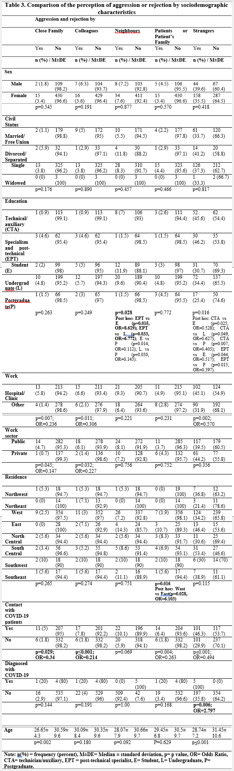 In terms of the post-hoc analysis by education, students, and those with a degree in nursing were those who presented had a greater risk for the perception of violence and/or rejection by neighbours. For the perception of violence and/or rejection by strangers the at- risk-groups were those with a technical or auxiliary background, and nurses with a post- technical specialism. In terms of location and the perception of violence and rejection by patients and their family members, differences were found between the West and East, with the East having greater risk.