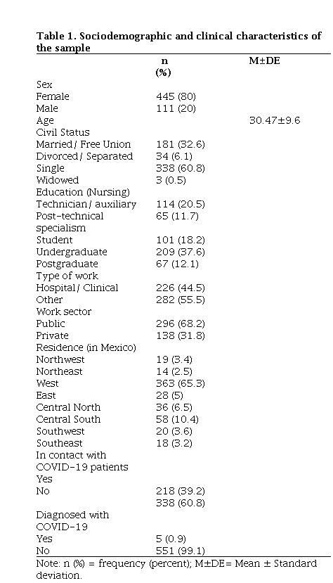 The sociodemographic characteristics of the 556 participants are shown in Table 1. The number of nurses that have perceived aggression or rejection due to COVID-19 from family members were 17 (3.1%), from colleagues 23 (4.1%), neighbours (7.6%), patients or patient's family members 20 (3.6%), and/or by strangers 202 (36.3%). Regarding the result of Goldberg's General Health Questionnaire (GHQ), 47 (8.5%) of nurses obtained significant scores in the dissemination of somatic symptoms, 117 (21%) in anxiety-insomnia, 27 (4.9%) in social disfunction and 14 (2.5%) in depression.