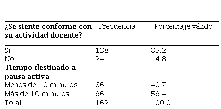 Como dato relevante a lo anterior se agrega que, de la muestra total, el 85.2% (n= 138) está conforme con su actividad docente, mientras que el 14.24% (n= 24) no tiene conformidad con su trabajo docente. Además, sobre el tiempo destinado a pausa activa, los participantes responden que el 59.4% (n= 96) tiene más de 10 minutos y el 40.7% (n= 66) menos de 10 minutos. Ver Tabla 3.