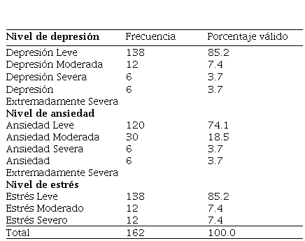 Como segundo objetivo del estudio se pretendió determinar los niveles de estrés, ansiedad y depresión de este personal académico. Ver Tabla 4. El primer resultado es el nivel de depresión, el 85.2% (n= 138) presenta depresión leve; mientras que el 7.4% (n= 12), 3.7% (n= 6) y 3.7% (n= 6) presenta depresión moderada, severa y extremadamente severa, respectivamente.