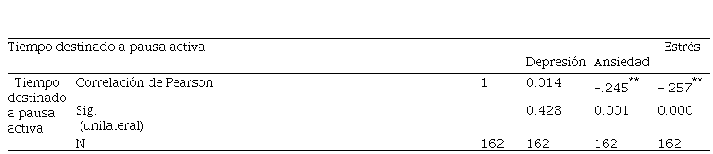 Finalmente, se realizó una correlación entre el tiempo destinado a la pausa activa y los niveles de depresión, ansiedad y estrés. Ver Tabla 6. Los resultados indican que existe una correlación significativa inversa del tiempo destinado a pausa activa en el nivel 0.01 (unilateral -.257**) con el Estrés, y de nivel 0.01 (unilateral, -.245**) con la Ansiedad. Estos datos demuestran que, a mayor tiempo destinado a pausa activa, menor será la presencia de Ansiedad y Estrés. No se encontró ningún dato significativo de correlación entre este componente con la Depresión.