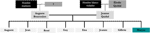 Su madre era maestra y su padre banquero jubilado, quiénes contraen matrimonio en una especie de conveniencia: “Tal vez me equivoco, pero sospecho que el amor no tuvo mucho que ver en la decisión” (Condé 1999, 60). Ambos padres eran hijos únicos y provenían de historias familiares de violencia en abandono (por el lado paterno) y de violencia sexual (por el lado materno). La siguiente Figura 1 ubica la composición familiar: