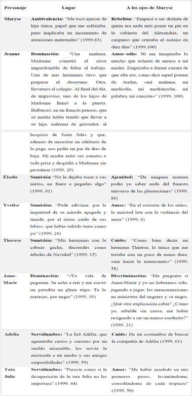 En la siguiente, sobre la cartografía de personajes, ilustro como las feminidades de la novela reflejan estos tres lugares: 1. el de dominación, corporalizado por los personajes de la madre y de Anne-Marie, quiénes desde lugares de poder distinto, ejercen sumisión sobre mujeres inferiorizadas. 2. El de sumisión y servidumbre, escenificado por las mujeres al servicio doméstico y afectivo de la familia y 3. El de la Rebelión, personificado por Maryse y su fuerza para mirar distinto: