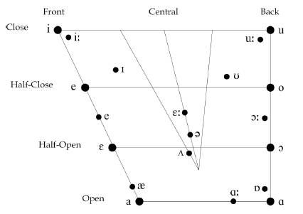 Las vocales son sonidos que se producen con las cuerdas vocales, por lo que se trata siempre de sonidos sonoros en los que las cuerdas vocales no dejan de vibrar. Los factores que determinan la calidad de una vocal son principalmente la forma de la boca y la posición de la lengua. Para dar forma a la boca nos valemos de dos tipos de movimientos: el movimiento de la mandíbula (vocales abiertas o cerradas) y el movimiento de los labios (vocales estiradas o redondeadas). En cuanto a la lengua, podemos ir desde posiciones cercanas a los labios, a otras cercanas a la úvula (vocales anteriores o posteriores). Además de la calidad vocálica, las vocales pueden diferir en función de su longitud, esto es, la duración del sonido (vocales cortas y largas) o en función del orificio (nariz o boca) por donde sale el aire (vocales nasales y orales).