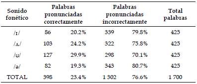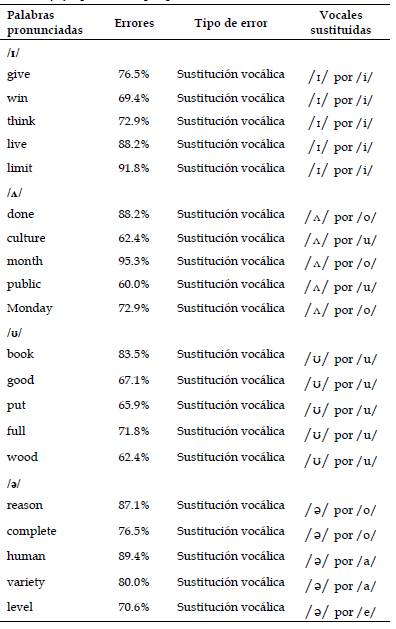 Por consiguiente, se demuestra que la gran mayoría de las palabras analizadas, que incluyen los sonidos vocálicos cortos y débiles fueron pronunciadas incorrectamente, debido a que los estudiantes sustituyen los sonidos vocálicos /i/, / Λ /, /℧, / Ә /, característicos del idioma Inglés, por un sonido similar al de la lengua materna -en este caso español-. Por lo tanto, la pronunciación resulta inexacta y su Inglés suena poco natural. Alatis (1993) dice con respecto a los hablantes nativos que: