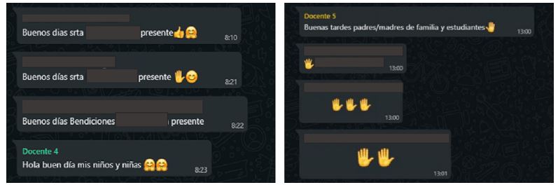 La primera práctica observada es una simulación de aula presencial que las docentes hacen en sus interacciones con estudiantes y padres en los grupos de WhatsApp. Se mantienen varias convenciones de una interacción áulica. Las docentes saludan a los estudiantes y padres y estos responden como si estuviesen en un aula. Este saludo ocurre en la mañana o la tarde, según si es jornada matutina o vespertina. Algunos estudiantes y padres saludan, indican estar "presente" o envían el ícono de una mano alzada, emulando la toma de asistencia. La Figura 1 presenta los saludos de dos docentes y la respuesta de los estudiantes.