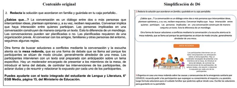 El Mineduc (2020e, p. 8) permite hacer cambios a las fichas pedagógicas siempre que no se desvíen de los objetivos curriculares. Las docentes hacen versiones adaptadas de las fichas pedagógicas y las envían a los grupos de WhatsApp. Se observan dos acciones: simplificar o añadir textos, contenidos e instrucciones. En ambos casos, existe una considerable modificación de la presentación visual de las fichas. Se añaden imágenes, esquemas y colores. Un ejemplo es la ficha adaptada de D6, como consta en la Figura 2.