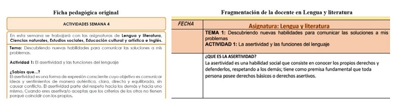 Los currículos proponen aprendizajes autónomos e interdisciplinarios para los estudiantes (Mineduc, 2020a; 2020b; 2020c). Una metodología para ello es el aprendizaje basado en proyectos, o logros de conocimientos interdisciplinarios que se alcanzan en cada ficha pedagógica (Mineduc, 2020d; 2020e). Sin embargo, las docentes suelen fragmentar el aprendizaje por asignaturas. Se observa en las instrucciones que entregan por WhatsApp. Por ejemplo, D1 menciona que una actividad pertenece a Lengua y Literatura. Las precisiones también aparecen en las adaptaciones a las fichas pedagógicas, como en la Figura 3, donde D4 aclara que una actividad corresponde a Lengua y Literatura.