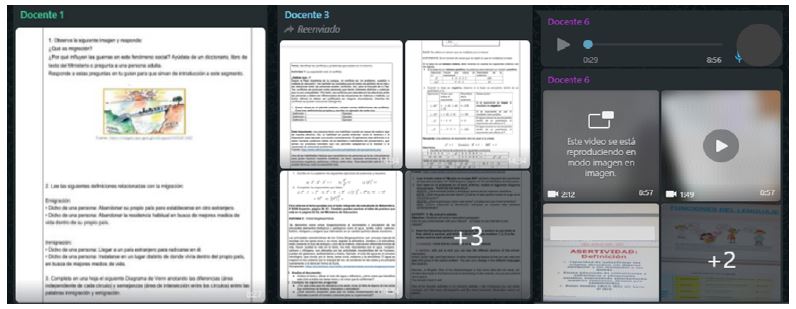 Las docentes reciben la presión de evitar la deserción estudiantil, en un contexto de padres con dificultades para participar en la educación remota. Esto las motiva a enviar las actividades de las fichas pedagógicas en formatos accesibles, como capturas de pantalla con las actividades diarias y documentos en Word o PDF. También se añaden videos y notas de voz para explicar contenidos e instrucciones a los estudiantes, como en la Figura 4.