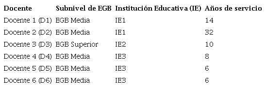 Esta investigación consideró como caso a los docentes de planteles fiscales. Las participantes fueron seis profesoras de Educación General Básica (EGB) Media y Superior en la Región Costa del Ecuador. El proceso de selección de las docentes fue según la disponibilidad y voluntad de las mismas para participar del estudio. Sin embargo, se tomaron los siguientes criterios: (1) las docentes deben trabajar en instituciones educativas fiscales, (2) deben tener un mínimo de dos años de experiencia en el sector público, (3) aplican los currículos compactado o priorizado con sus estudiantes, y (4) enseñan en Educación General Básica Media o Superior, en modalidad ordinaria; según la Ley Orgánica de Educación Intercultural (2011), esta refiere a los servicios educativos para niños y adolescentes en edades preferentes. El propósito de dichos criterios es tener casos típicos, o aquellos con cualidades comunes que permiten una comprensión general de un fenómeno (Yin, 2018; Gerring & Seawright, 2007). La Tabla 1 describe a las participantes.