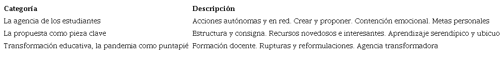 A continuación, se desarrollan las tres categorías emergentes sintetizadas en la Tabla 1.