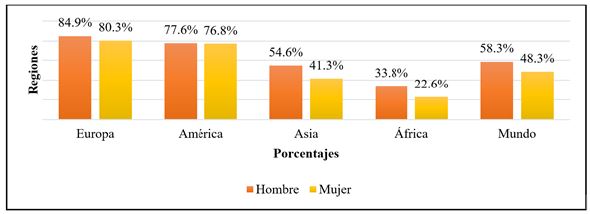 Según cifras presentadas por la UIT, en la mayor parte de los países del mundo las mujeres se encuentran en condiciones de vulnerabilidad ante la desigualdad presente en el acceso y uso de las tecnologías digitales en comparación a los hombres. Este organismo, estima en su informe Measuring digital development: Facts and figures 2019, que más de la mitad de la población femenina a nivel mundial todavía no utiliza Internet con un 52,7 %, frente al 42,7 % de los varones (Figura 1) (UIT, 2019a; UIT, 2019b).