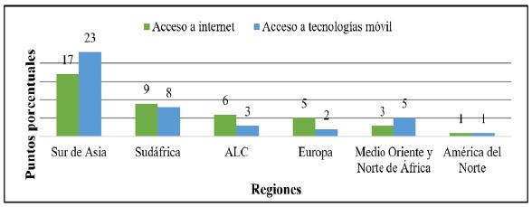 En México, esta situación es similar, reportando una diferencia porcentual de 11 puntos en el acceso a internet, y de 5 puntos en el acceso a la telefonía móvil (UIT, 2019a). Estos datos se deben a que, como bien explica el comisionado presidente del Instituto Federal de Telecomunicaciones (IFT), en el país se encuentran latentes tres brechas que habría que combatir: (a) cobertura, (b) conectividad y (c) apropiación. Aun cuando en México se tiene una cobertura de redes catalogada como de última generación capaz de llegar a más del 90 % de la población, esta no garantiza la conexión a internet; habría que considerar la disponibilidad del recurso tecnológico como un teléfono inteligente o un equipo de cómputo, además del servicio correspondiente; lo que exhibe que cobertura no equivale a conectividad. Mientras que un tercer elemento es la apropiación, es decir, el uso otorgado a estos valiosos recursos (Sosa, 2020). Acorde a la Encuesta Nacional sobre Disponibilidad y Uso de Tecnologías de la Información en los Hogares (ENDUTIH) realizada por el Instituto Nacional de Estadística y Geografía (INEGI), solo el 56,4 % de los hogares cuentan con internet, de los cuales el 44,3 % dispone de una computadora y únicamente el 44,6 % la utiliza para fines escolares (INEGI, 2019). Según las cifras publicadas por After Access en el año 2019, la falta de conocimiento sobre cómo hacer uso de la red representa una limitante en el acceso a esta, vislumbrando este escenario en el 40 % de las mujeres encuestadas en contraste con un 33 % de los hombres. Este caso es altamente similar en la telefonía móvil, en donde de un total de 85 países que proporcionaron datos sobre propiedad y uso de estos recursos, 61 reportaron que el 35 % de las mujeres encuestadas no sabe cómo utilizarla, frente a un 24 % de hombres (BID, 2020).