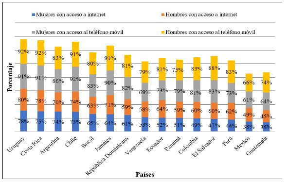 Según explica el Banco Interamericano de Desarrollo (BID), particularmente en la región de América Latina y el Caribe (ALC), los índices de conectividad son más bajos, ya que solo el 53,0 % de la población se encuentra conectada a la red (BID, 2020). En términos de brechas digitales de género, ALC se encuentra mejor posicionada que otras regiones del mundo; el porcentaje de acceso a internet en la región fue del 63,0 % para hombres y el 57,0 % para mujeres, manteniendo un gap de 6 puntos. Mientras que el acceso y uso de la telefonía móvil fue del 83,0 % en los varones y el 80,0 % en las mujeres, es decir, una diferencia porcentual de 3 puntos (Figura 2).