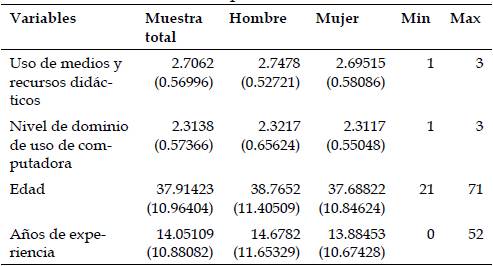 Para la selección de los participantes se recurrió a un muestreo voluntario, el cual, según explican Sánchez y sus colaboradores (2015), "consiste en formar una muestra solicitando a miembros de la población que respondan a voluntad una encuesta o que participen en un experimento" (p. 160). A partir de esta técnica se logró recopilar información de 548 docentes de nivel básico (79 % mujeres y 21 % hombres) de entre 21 y 71 años, quienes consintieron el uso de sus datos no sensibles, logrando una muestra representativa de docentes de educación básica de escuelas públicas del estado de Nuevo León, México, con un nivel de confianza del 95 %, con un margen de error del 5 %, cumpliendo con los 382 participantes requeridos. Cabe destacar que, si bien el presente estudio es de corte exploratorio dada la participación voluntaria de los maestros, la muestra es igualmente representativa a nivel género con un mínimo de 380 maestras (SENL, 2021). La muestra da pauta para estimaciones representativas de la población docente en general y no para grupos particulares ni de edades, ni de municipios. La muestra obtenida no permite un analisis en profundidad de los elementos que interactuan con las brechas digitales y por ello el estudio se concentra en aquellas variables que pudiesen explicar una brecha digital desagregada por el género (Tabla 1). Este tipo de investigaciones, de acuerdo con Hernández y sus colaboradores (2016):