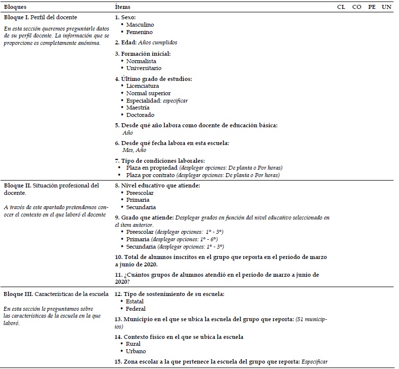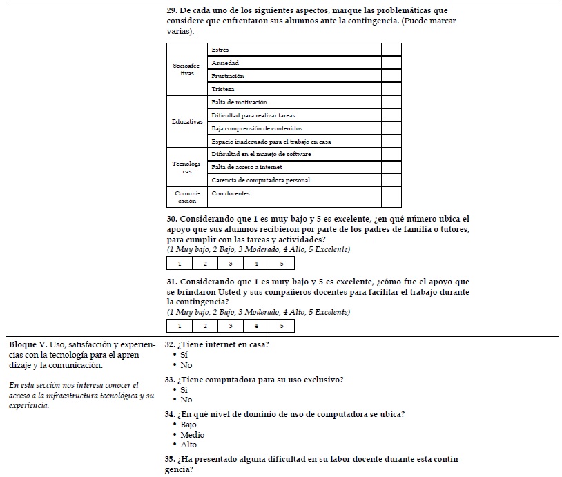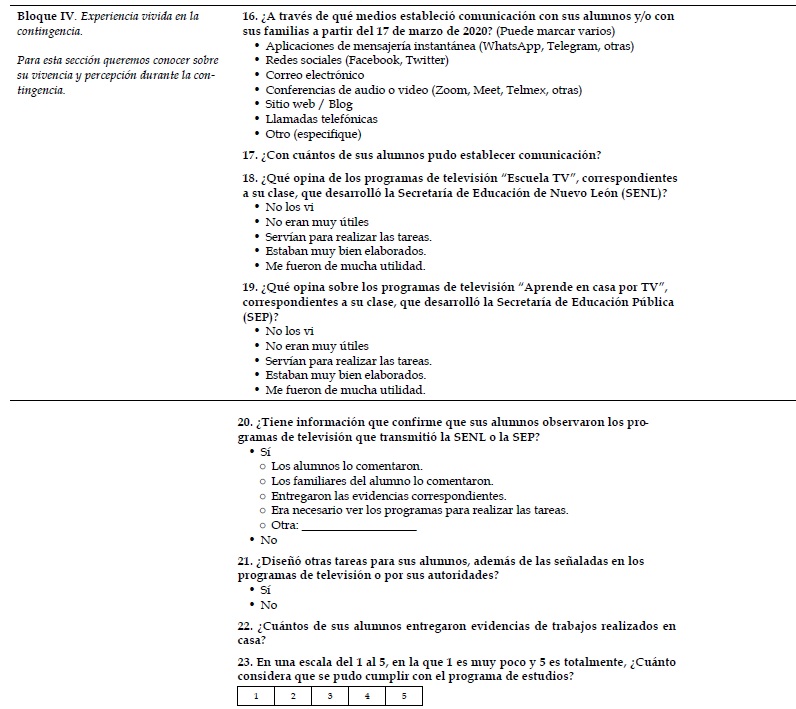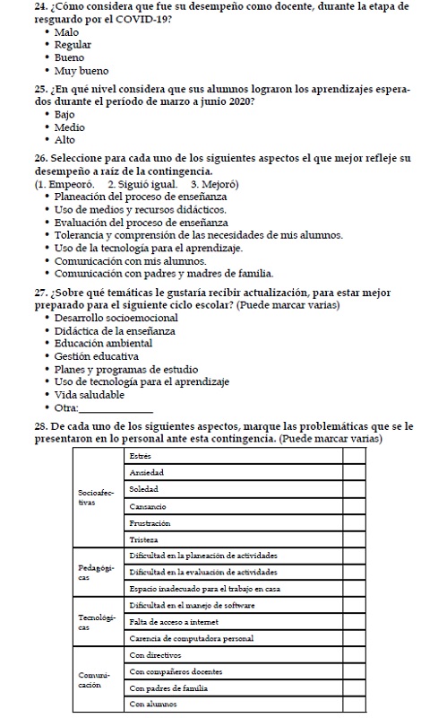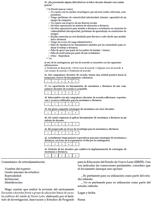 Con base en estudios relacionados con la temática y aprovechando la experiencia vivida y compartida por docentes desde la práctica, hemos elaborado el instrumento titulado: Encuesta a docentes frente a grupo de educación básica de escuelas públicas del estado de Nuevo León.
