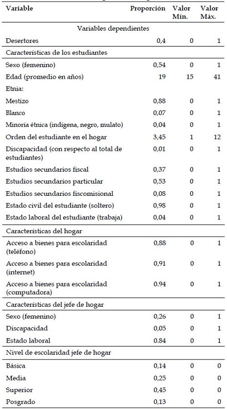 La tabla 1 muestra que, para un total de 2.418 matriculados, el 40 % desertó de la carrera, culminando un total de 1.450 estudiantes. Con respecto a las características del matriculado, el 54 % es de sexo femenino, el 88 % de matriculados son mestizos, el 7 % blancos, el 4 % pertenecientes a una minoría étnica (indígena, negro, mulato). La edad promedio de los matriculados es de 19 años, siendo la edad más alta 41 años y la más baja 15. El 1 % de los matriculados registran un nivel de discapacidad. En promedio, los matriculados se ubican en tercer lugar dentro de su núcleo familiar. Con relación a su educación secundaria, el 37 % de los matriculados menciona haber cursado en una institución fiscal, el 53 % en una institución particular y el 8 % en una fiscomisional. En lo que respecta a su estado civil, el 98 % de los estudiantes se registra como soltero. Finalmente, el 4 % de los estudiantes menciona haber realizado una labor remunerada la semana previa al levantamiento de la información.