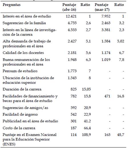 El interés en el área de estudio, sugerencias familiares e interés en las líneas de investigación son las opciones más escogidas. La relación entre estas respuestas y las demás opciones es amplia, como se puede ver en la ratio. La idea del retorno en el ámbito laboral apenas se ubica en 6° lugar, lo cual es significativo. Para 2017, se reprodujo la misma tendencia. El interés personal en el área de estudio aparece como la respuesta mayoritaria. En general, nuevamente los gustos personales y el entorno familiar son aspectos decisivos para seleccionar esta carrera. La demanda apenas constituye la 4a opción y, según la ratio, el interés en el área de estudio es 5 veces más relevante. Es importante considerar que las dimensiones recabadas corresponden a aquellos aspectos que destacan en la motivación de aquellos alumnos que lograron culminar con éxito la carrera.