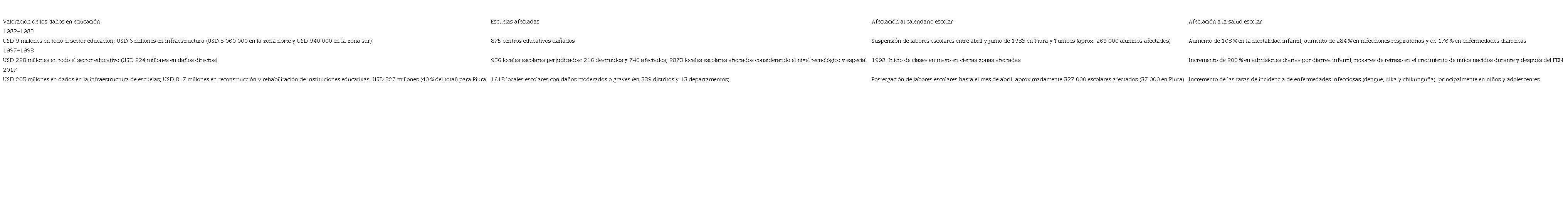 En el período 1982-1983, se suspendieron las labores escolares entre abril y junio en Piura y Tumbes, lo que afectó la continuidad educativa de unos 269 000 alumnos (INDECI, 2019a, p. 189). En ese sentido, a inicio de año, las clases tuvieron entre dos y tres meses de retraso en las dos regiones más afectadas. No obstante, se tiene poca información exacta sobre el número preciso de escuelas y estudiantes implicados. El FEN de 1997-1998 generó un retraso del inicio de clases de entre uno y dos meses, por lo que el año escolar comenzó entre abril y mayo de 1998 en el norte del país (La República, 1998). En 2017, se reportó la postergación del inicio del año escolar hasta abril, poco más de un mes después del inicio programado, lo que afectó aproximadamente a 327 000 escolares (El Comercio, 2017). Ese año, solo en Piura, 37 000 estudiantes experimentaron este retraso, lo que destaca la severidad del impacto en esta región (ReliefWeb, 2019).