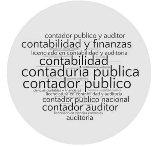 En la muestra se pueden diferenciar 50 denominaciones, algunas con variaciones menores que describen el mismo grado o título (licenciatura o licenciado, contaduría o contador), y otras variantes que podrían indicar el desarrollo de investigación científica en el área (ciencias contables), el enfoque hacia el sector público (contador público nacional) o alguna especialidad en las subdisciplinas relacionadas (contabilidad y auditoría, contabilidad y finanzas, contabilidad y gestión tributaria). Al desambiguar las diferencias menores, llegamos a reconocer 40 denominaciones diferentes para la carrera profesional de contabilidad. La nube de palabras (figura 2) representa las denominaciones más frecuentes en la muestra; las más comunes son “contador público/contaduría pública”, “contabilidad”, “licenciatura/licenciado en contabilidad y auditoría”, y “contabilidad y finanzas”.
