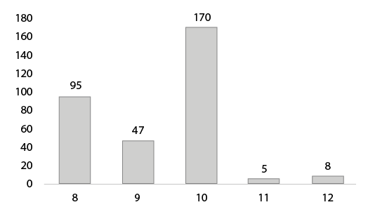 La duración promedio de los programas en la muestra es de 9,1 semestres, en un intervalo (definido en el límite inferior por diseño muestral) de 8 a 12 semestres, como se presenta en la figura 3. La moda en la muestra es de 10 semestres para los programas. Estos presentan a su vez un promedio de 50,9 cursos y/o actividades curriculares, con un intervalo de 30 a 83 actividades.