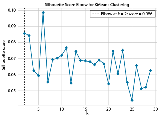 El indicador de Silhouette, por su parte, proporciona una medida de cuán cerca se encuentran los puntos en un clúster y cuán separados están de los puntos en otros clústeres. Los valores del indicador oscilan entre –1 y 1; un valor alto denota que los puntos están adecuadamente agrupados, y un valor bajo señala que los puntos se encuentran cerca de un límite de decisión entre dos clústeres. Los resultados obtenidos a partir de estos dos tests fueron divergentes. Tal como se observa en las figuras 4 y 5, el método del codo sugiere que el número óptimo de grupos es doce, mientras que el indicador de Silhouette propone dos clústeres como la opción más adecuada. Estos resultados se interpretan como una indicación de la significativa similitud entre el contenido de los perfiles de egreso, lo cual dificulta su diferenciación. No obstante, es posible generar una segmentación coherente con un número considerablemente grande de clústeres. Sin embargo, este mayor número de clústeres resultó en que algunos solo contuvieran a una institución, lo que sugiere que esta se diferencia de las demás de manera muy sutil.