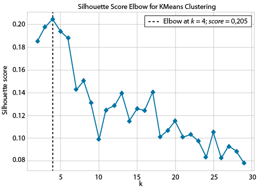 Para determinar el número ideal de agrupación de datos, se recurrió al método del codo (elbow method) y al indicador de Silhouette. El primero es una técnica que grafica la variación en el conjunto de elementos en función del número de clústeres. Al incrementar el número de clústeres, la suma de las distancias al cuadrado (sum of squared errors, o SSE) tiende a disminuir. El “codo” se refiere al punto en el gráfico en que la tasa de disminución de la SSE se reduce drásticamente, lo cual sugiere un número óptimo de clústeres.