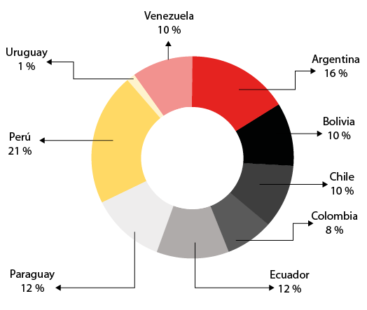 El levantamiento de información permitió identificar 345 programas de contabilidad, de los cuales 325 presentaban información completa sobre denominación, perfil de egreso y malla curricular, accesible públicamente en los portales web oficiales de las instituciones de educación superior. Estos programas tienen una duración mínima de ocho semestres (o su equivalente para programas en modalidad trimestral o bimestral). Los países incluidos en la muestra fueron Argentina, Bolivia, Chile, Colombia, Ecuador, Paraguay, Perú, Uruguay y Venezuela. La figura 1 ilustra la distribución de registros recopilados por país.