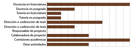 Todas las entrevistadas manifiestan que haber ingresado al SNII no ha cambiado su situación laboral dentro de la institución. El mayor beneficio mencionado es que la adscripción al SNII les permite obtener el estímulo económico del CONAHCyT y ser consideradas para actividades como colaboraciones y comisiones académicas. En la siguiente figura se aprecian las actividades y comisiones que llevan a cabo las profesoras.