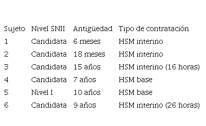 La edad promedio de las participantes es de 32 años; la más joven tiene 31 años y la mayor, 51. El 67 % de las investigadoras son solteras y el resto, casadas con hijos. Las participantes obtuvieron su grado de doctor en el período 2016-2020. El 33 % obtuvo el ingreso al SNII en 2020 y el 67 %, en 2021. En promedio, las investigadoras son contratadas por quince horas a la semana. En la siguiente tabla se aprecian el nivel, la antigüedad y el tipo de contratación de las entrevistadas.