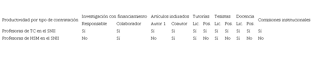 Las políticas educativas para la contratación de profesores de tiempo completo quedan supeditadas a los lineamientos de PRODEP y a las políticas institucionales, que se convierten en una especie de círculo vicioso, tortuoso y de simulación: en estas convocatorias se les pide experiencia en docencia, investigación, tutorías y productividad académica, aspectos difíciles pero que las profesoras cumplen a pesar de todo. Sin embargo, mantenerse en el SNII les resulta complicado, pues su condición laboral no les permite participar en proyectos con financiamiento externo, dirigir tesis de posgrado o participar en comisiones académicas que reflejen un liderazgo académico e investigativo, como ser responsables de comisiones institucionales de investigación, reestructuración de programas educativos, seguimiento de egresados, entre otras.