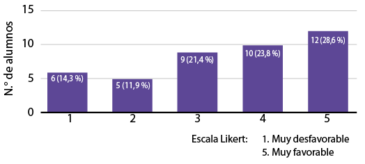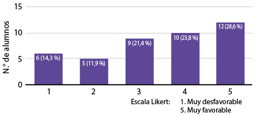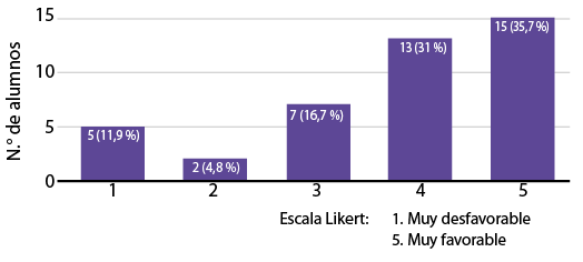 La clara superación evidenciada en el proceso muestra actitudes de compromiso y dedicación. Seguramente, las pautas dadas en la consigna contribuyeron a generar actitudes necesarias para las competencias en desarrollo. Las respuestas de los estudiantes a la pregunta 6 de la encuesta (figura 2) van en esta línea, con un promedio de respuestas positivas de 3,3.