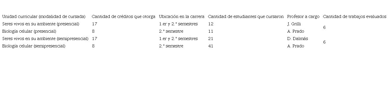 Los grupos de clase involucrados en la experiencia fueron dos y corresponden al 1.er año de la carrera de Profesorado en Ciencias Biológicas. La cursada se llevó a cabo en uno de los grupos por modalidad presencial y en el otro por modalidad semipresencial (b-learning). En la tabla 2 se presentan otras características de las UC y de los grupos participantes de la experiencia.