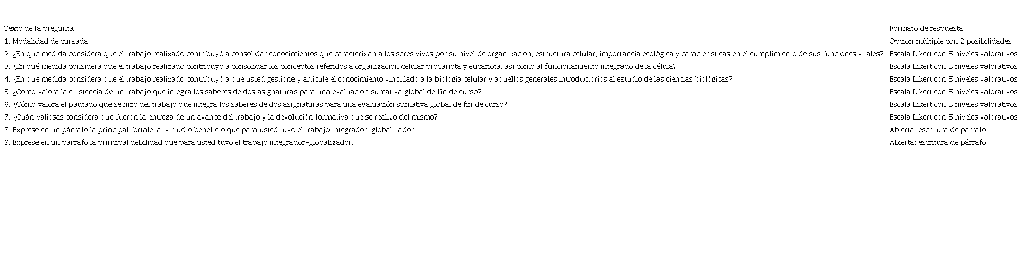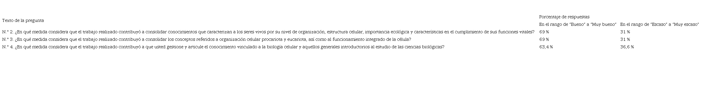 Hacemos ahora un análisis de las producciones generadas por los estudiantes en cuanto a las dimensiones cognitivas, instrumentales y actitudinales de las competencias específicas que se buscaron desarrollar (Valle & Manso, 2013). Con respecto a lo cognitivo, nos interesó particularmente ver, en este primer año de la formación de grado de profesor en Ciencias Biológicas, en qué medida se tiene un panorama global del funcionamiento y de las propiedades de los sistemas vivientes (Gagliardi, 1986). Estos aspectos fueron considerados en la valoración de la experiencia que hacen los estudiantes en las preguntas 2, 3 y 4 de la encuesta y que presentamos en la tabla 7. Entre un 63 % y un 69 % de los alumnos hacen una valoración positiva de los aprendizajes conceptuales adquiridos, lo que se condice con el avance evidenciado entre la evaluación formativa y la sumativa final en los ítems de precisión y profundidad conceptual en “Seres vivos en su ambiente” (de 1,5 a 2,4 en el global) y en “Biología celular” (1,2 a 2,1 en el global) (tablas 5 y 6).