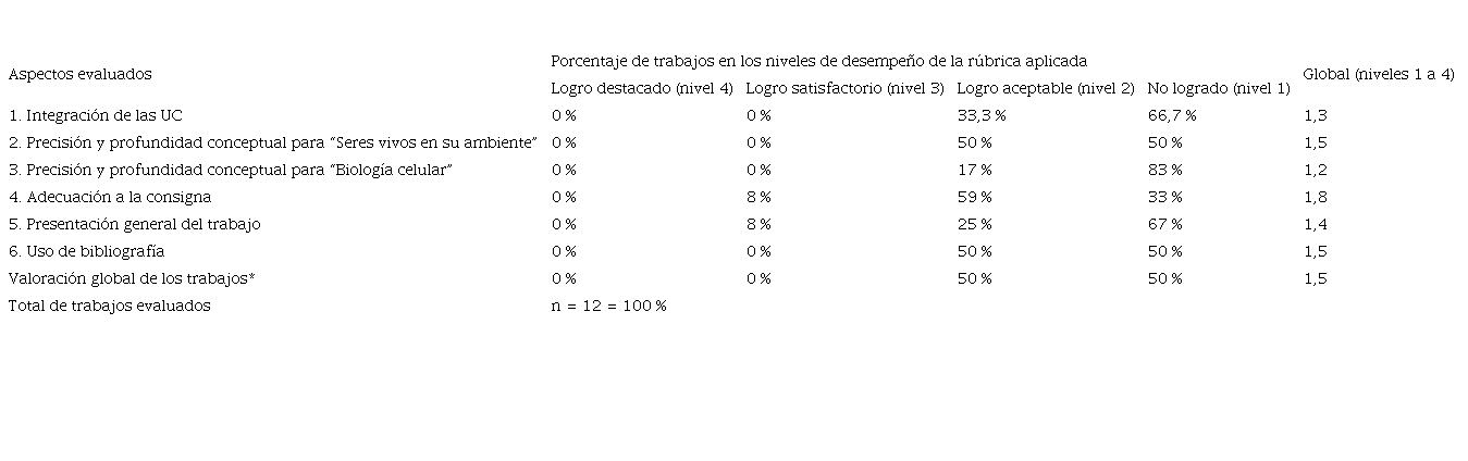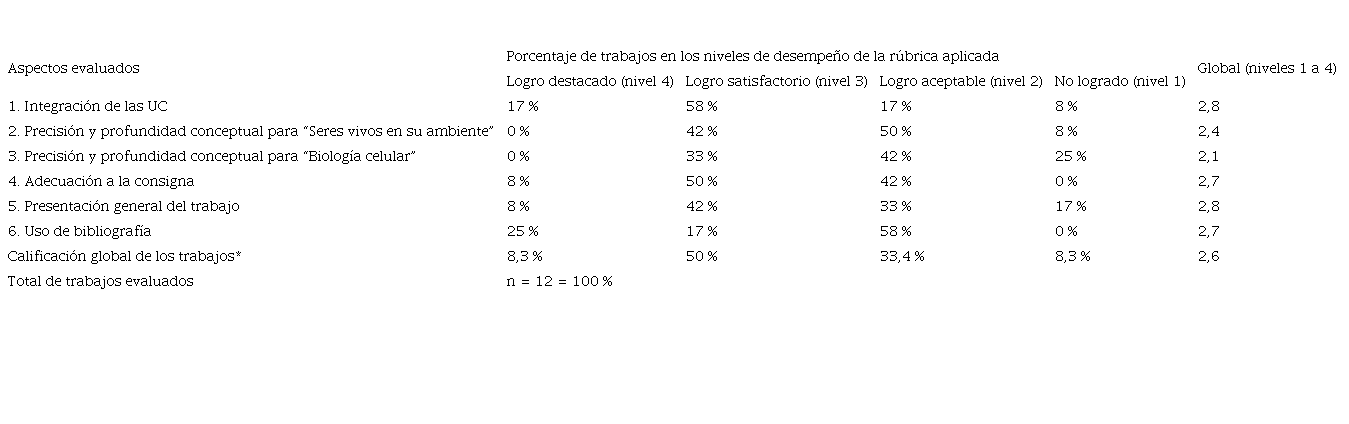 Viendo en el trabajo final entregado los resultados de cada aspecto evaluado con la rúbrica, el nivel más bajo corresponde a “Precisión y profundidad conceptual para ‘Biología celular’” (promedio global de 2,1) y el nivel más alto, a “Integración de las UC” y “Presentación general del trabajo” (promedio global de 2,8). Con respecto al primer aspecto, un 25 % de los trabajos entregados no fueron aceptables en la precisión y profundidad conceptual de la disciplina “Biología celular”. Además, no hubo ningún trabajo en el nivel destacado para este aspecto. Interpretamos este resultado por las características de la tarea pautada: la mayoría de los aspectos a comparar entre los organismos seleccionados referían a temas abordados en la UC “Seres vivos en su ambiente”, lo que llevó al alumno a jerarquizar estos en detrimento de los puntos 3 y 4 de la consigna, que apuntaban a conceptos abordados en la UC “Biología celular” (tabla 3).