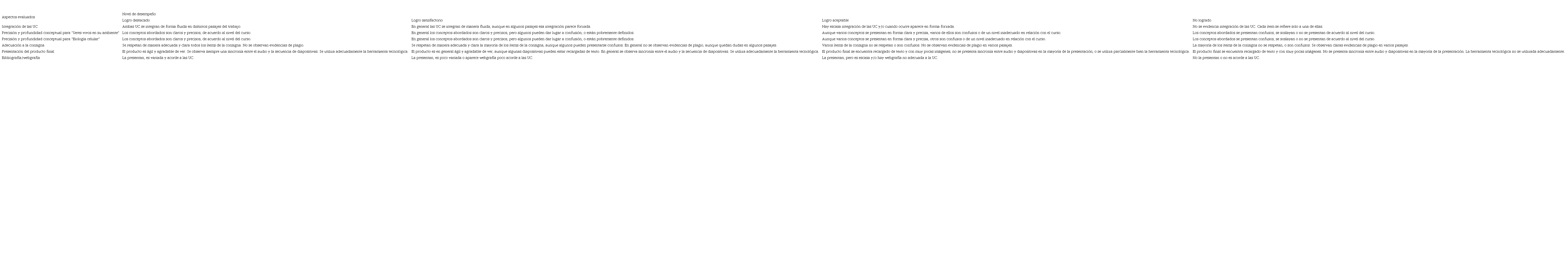 En el primer punto vemos que los diferentes aspectos de la biología de los organismos que debían ser contemplados en el trabajo final (ubicación taxonómica, nivel de organización corporal, nivel de organización celular, modalidad de nutrición, modalidad de reproducción, ubicación en el ecosistema, etc.) implicaron la utilización/aplicación de los grandes conceptos enseñados en las clases que tuvieron durante el desarrollo de ambas UC. Los cinco primeros aspectos de la rúbrica recogen esto y muestran un saldo favorable: la valoración promedio de esos cinco primeros ítems pasa de 1,4 en la evaluación formativa (tabla 5) a 2,6 en la sumativa final (tabla 6).