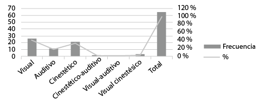 En esta misma fase se llevó a cabo un diagnóstico del estilo de aprendizaje del estudiantado, utilizando un cuestionario de programación neurolingüística (Secretaría de Educación Pública de México [SEP], 2004) que toma en cuenta ojo, oído y cuerpo como vías de ingreso a la información, a fin de seleccionar los recursos tecnológicos más apropiados para el diseño y la implementación de las innovaciones de lectura según el tipo de inteligencia de percepción dominante. Los datos obtenidos muestran que un 40 % de las y los alumnos se encontraba en la categoría visual; un 32 %, en la cinestésica; y un 18 %, en la auditiva. El restante 10 % corresponde a una combinación de categorías. Los resultados se presentan en la siguiente figura.