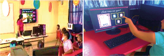 Actividades basadas en rimas: Otra sesión en la que se promovió la estrategia de la decodificación fue la undécima del nivel principiante, que consistió en identificar rimas a partir de juegos interactivos. La actividad comenzó con una demostración grupal en la pantalla, y luego se brindó espacio al estudiantado para que encontraran las rimas por sí mismos. La siguiente figura ilustra dicha estrategia.