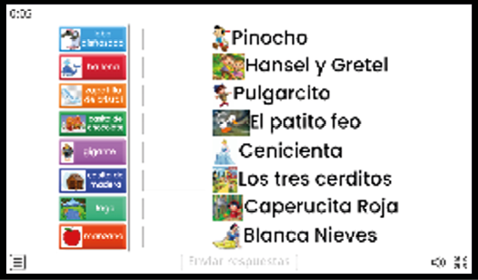 En la cuarta sesión del nivel elemental se implementó un juego digital similar, en el que se asociaron los elementos de cuentos clásicos con sus respectivos títulos; por ejemplo, la casa de chocolate como escenario del cuento “Hansel y Gretel”, y la ballena como personaje del cuento “Pinocho”. La figura 6 muestra el recurso digital empleado para la identificación de elementos clave.