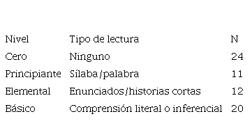 El proceso metodológico del estudio sigue las etapas de la investigación-acción práctica: planificación, acción, observación y reflexión (Latorre, 2004). En la primera fase se utilizó un instrumento validado de pretest de MIA para agrupar y enseñar en el nivel adecuado. Como se mencionó anteriormente, en el contexto de esta metodología se congrega al estudiantado en cuatro grupos, sin importar el grado escolar o la edad, de acuerdo con su nivel de competencia lectora: cero, principiante, elemental y básico. El nivel cero designa a aquellos que no tienen ningún tipo de lectura; el nivel principiante, a quienes pueden leer sílabas o palabras; el elemental, a quienes son capaces de leer enunciados o historias cortas; y el básico, a aquellos que poseen comprensión literal e inferencial. En consonancia con esta clasificación, las y los alumnos obtuvieron los resultados planteados en la siguiente tabla.