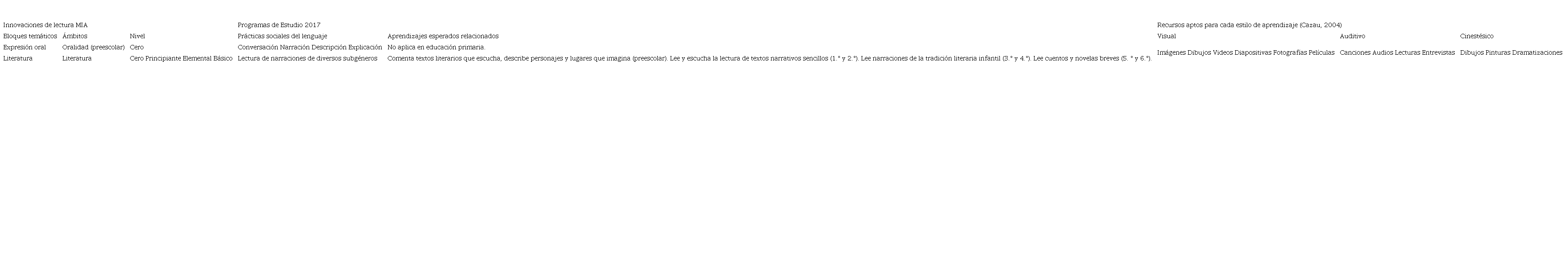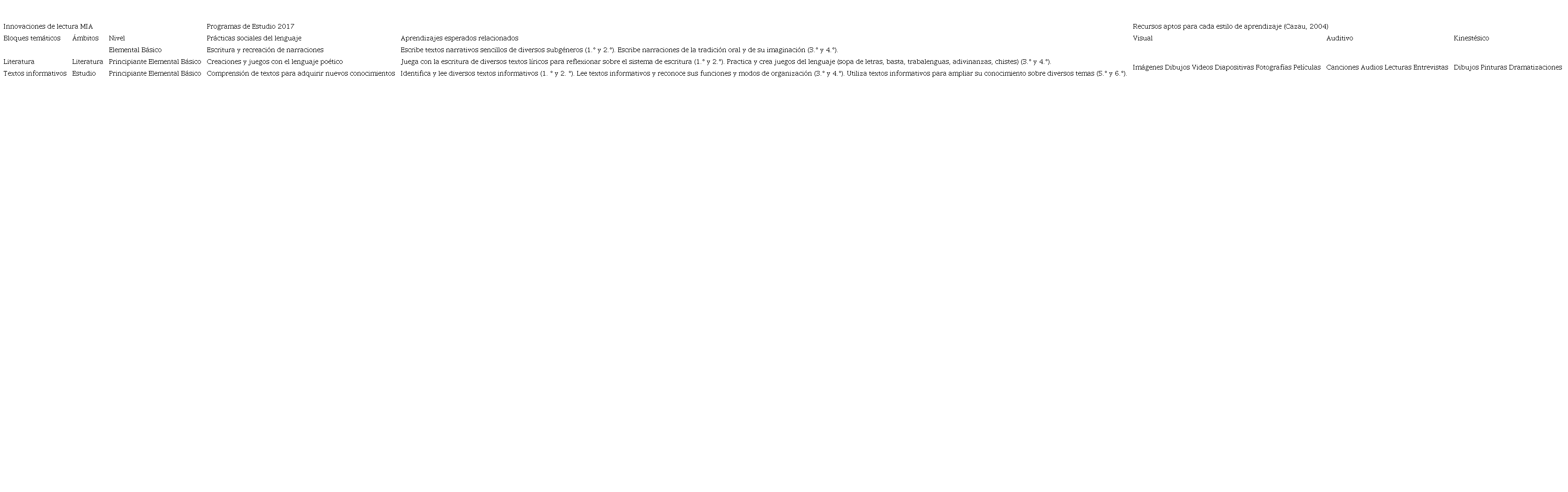 Asimismo, se planificaron actividades de lectura fundamentadas en MIA, con adecuaciones para entornos digitales, dirigidas a las cuatro agrupaciones. Para ello se alinearon los bloques temáticos y objetivos propuestos por esta metodología con los ámbitos, las prácticas sociales del lenguaje y los aprendizajes esperados específicos para la asignatura Lengua Materna Español, estipulados en los Programas de Estudio para la Educación Primaria 2017 (SEP, 2017). En el mismo tenor, se consideró la propuesta de Cazau (2004) para la elección de medios tecnológicos acordes a los estilos de aprendizaje visual, auditivo y cinestésico, tal como se muestra en la siguiente tabla.