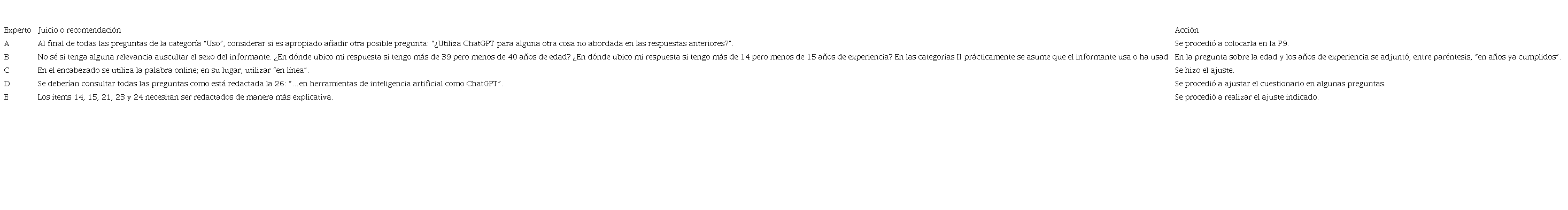 En la primera validación (juicio de expertos) se solicitó la participación a cinco catedráticos universitarios (para efectos de anonimización no se colocarán sus nombres) conocedores de la temática y de instrumentos de investigación. Ellos recomendaron lo siguiente: