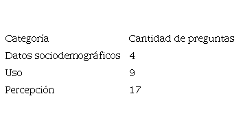La técnica de investigación fue la encuesta y el instrumento, un cuestionario inicial con 30 preguntas divididas en tres categorías: la primera, sobre datos sociodemográficos, con cuatro preguntas; la segunda, sobre el uso de ChatGPT, con nueve preguntas en una escala de Likert; y la tercera, sobre la percepción, con diecisiete preguntas en una escala de Likert.