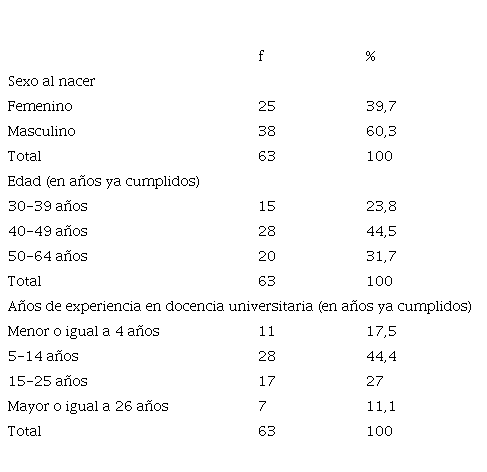 Al analizar los datos de las personas encuestadas, se encontró que contestaron en mayor porcentaje (60,3 %) las personas de sexo masculino al nacer; el 44,5 % tiene entre 40 y 49 años de edad ya cumplidos, y el 44,4 % lleva en la docencia universitaria entre 5 y 14 años. Asimismo, desde un análisis interno de los datos se pudo establecer que contestaron docentes de las 27 carreras que se establecieron para el estudio, excepto dos: Ingeniería Ambiental y Negocios Digitales. Ninguna de las personas que participaron tenía menos de 30 años.