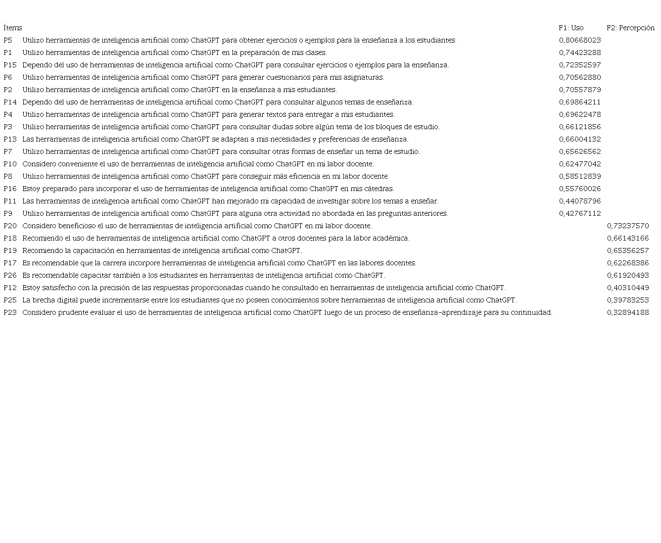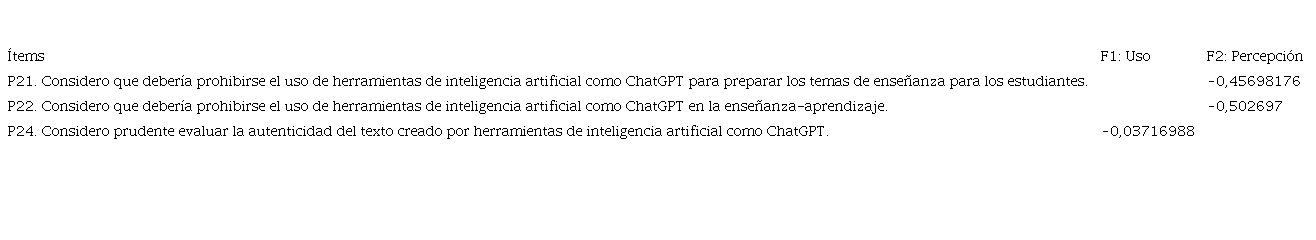 Asimismo, los dos factores planteados de manera teórica se presentan empíricamente en la exploración con el análisis factorial exploratorio, y determinan una nueva configuración en los ítems y en su aporte a cada factor, incluso sin los ítems de saturación más baja, según se aprecia en esta tabla.