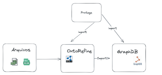 Inicialmente, o processo de importação de dados é realizado de forma manual, envolvendo a leitura de arquivos em formatos de planilha. Em seguida, esses dados são processados no Ontotext Refine3, em que são realizadas etapas de limpeza e mapeamento. Posteriormente, os dados são importados manualmente no formato RDF para o banco GraphDB. O processo de carga manual está ilustrado na Figura 2.