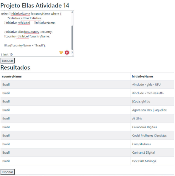 Finalmente, para o acesso aos dados é necessário disponibilizar os dados para consultas, sem uma preocupação com a usabilidade para usuários e sem conhecimento técnico. No contexto em que o GraphDB não possui um endpoint genérico para consultas SPARQL, desenvolveu-se na configuração piloto do servidor uma página HTML para suprir essa lacuna, permitindo execuções diretas de consultas. Enquanto muitas abordagens exigem ferramentas externas, a escolha aqui foi integrar-se diretamente ao GraphDB via HTML personalizado, simplificando o processo. A solução, ilustrada na Figura 4, oferece aos usuários mais técnicos uma interface acessível para consultas SPARQL, beneficiando especialmente aqueles usuário já familiarizados com a linguagem SPARQL e possibilita uma conexão com os dados em aplicações que sejam desenvolvidas com base nos dados da rede ELLAS. Para a implementação, a linguagem de programação Python foi utilizada.