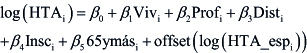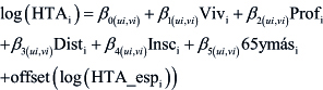 Posteriormente, para evaluar la relación entre la cobertura del tratamiento de hipertensión arterial y su relación con la distancia a los establecimientos de salud y con factores socioeconómicos del lugar, se calculó la razón de prevalencia bruta y ajustada, utilizando modelos de regresión global de Poisson a nivel de manzanas urbanas, obteniéndose así el modelo de la cobertura del tratamiento de hipertensión arterial de acuerdo a la siguiente expresión: